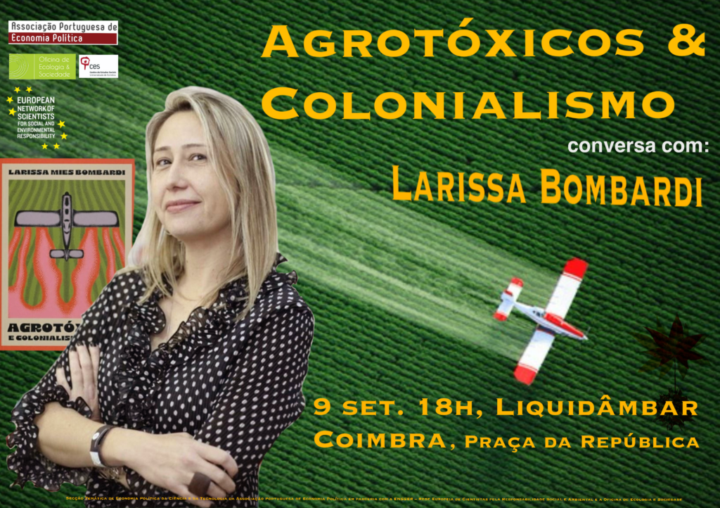 A conversation with the Brazilian researcher Larissa Bombardi, which will take place in Portugal at the city of Coimbra, Portugal, on 9 September 2025 at 18:00 at Liquidâmbar (Praça da República).